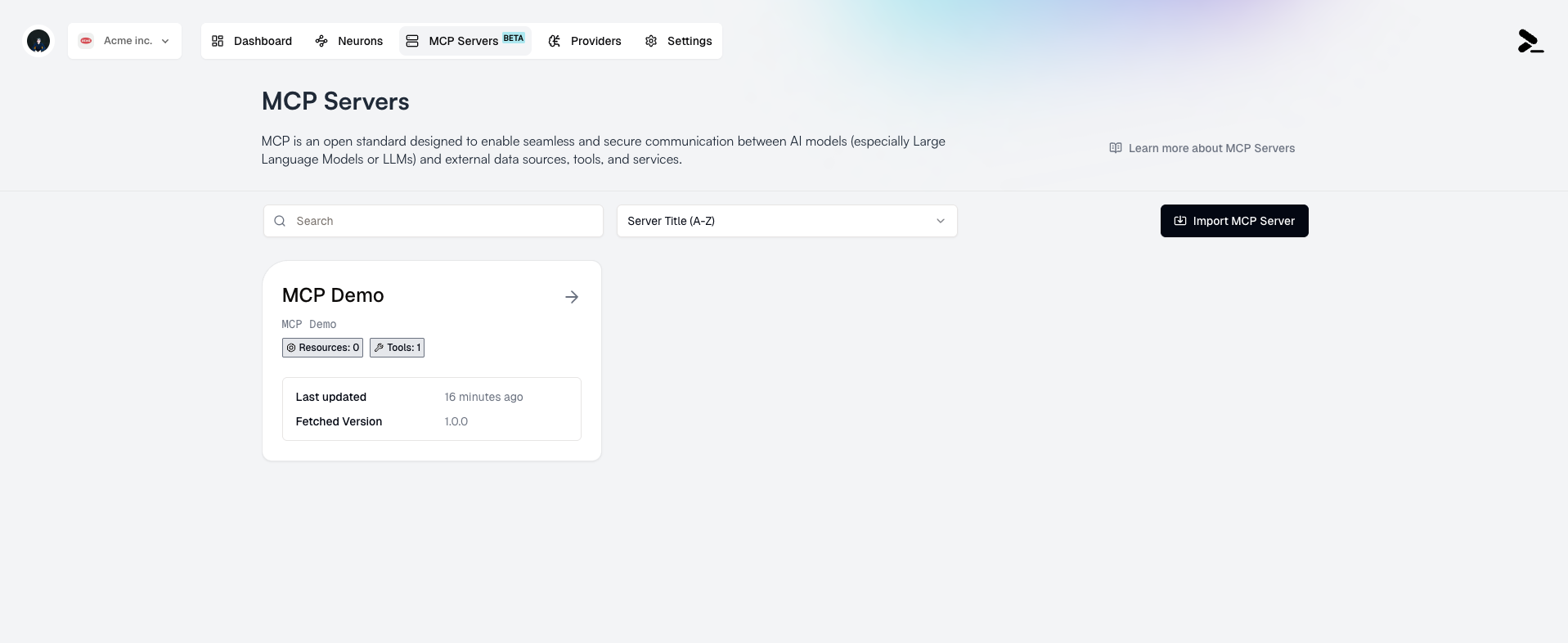 Model Context Protocol (MCP) is an open protocol that standardizes how applications provide context to LLMs. The MCP Servers feature in Prompteus allows users to import and configure remotely hosted MCP Servers over the Streamable HTTP transport to access and use Resources and Tools in your Neurons.Specification around remote MCP Servers are still in