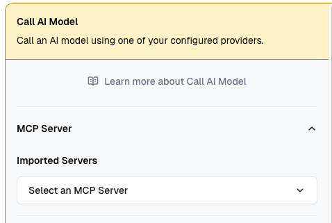 - In the Call AI Model node’s settings, select one or more MCP Servers from the Select an MCP Server dropdown.