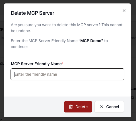 To delete an MCP Server:- Select it from the list of MCP Servers by clicking it’s card.
