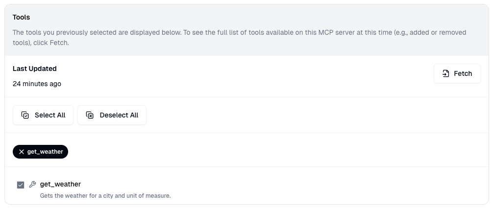 - Add a Friendly Name for the MCP Server if desired. This is optional, but may be useful for distinguishing between multiple MCP Servers that have different subsets of Tools and Resources selected.