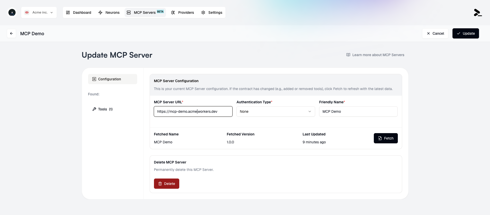 MCP Servers cannot be deleted if they are used in any Neuron workflows. A