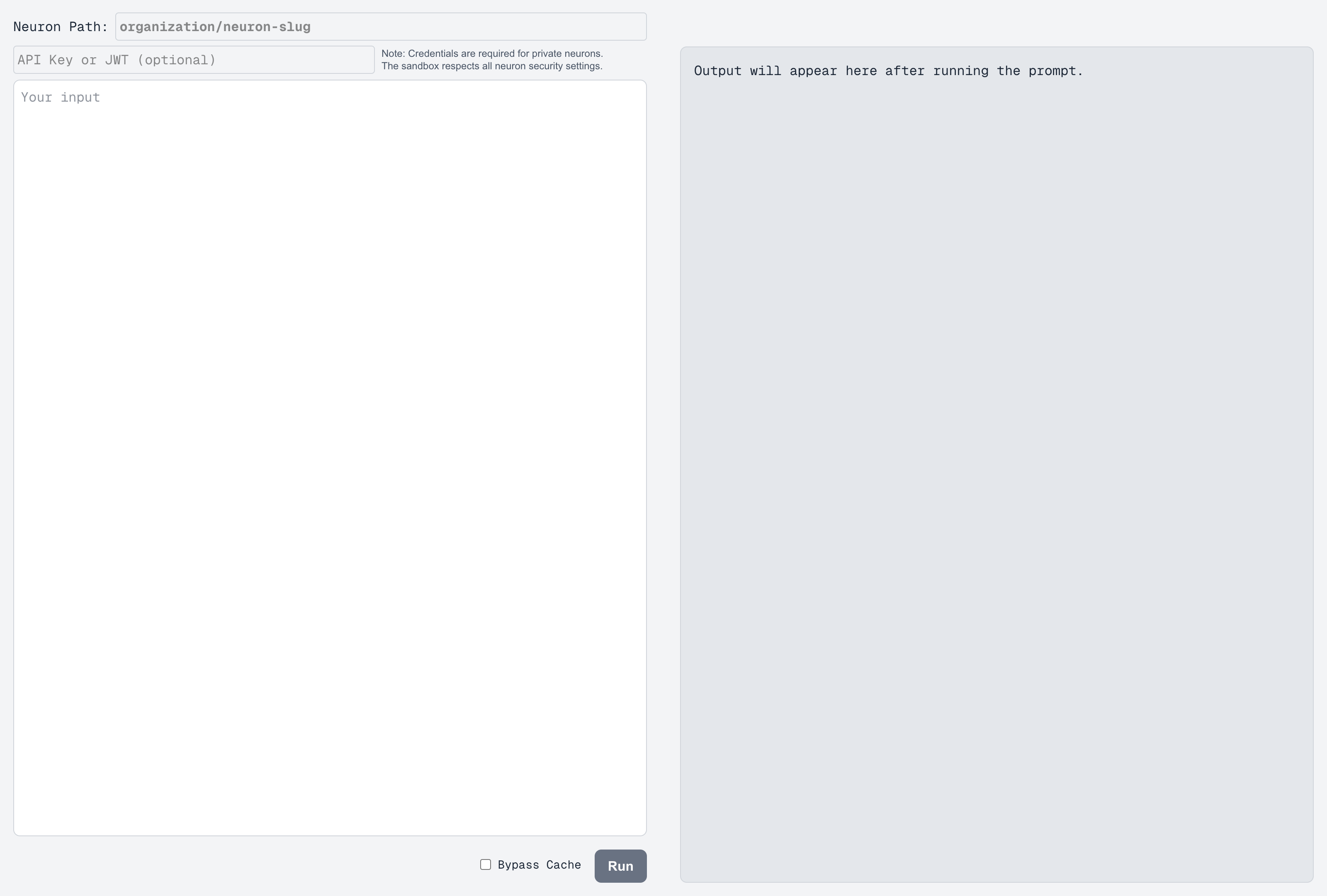 - Interactive Testing: Enter your Neuron path and input, then see the results in real-time